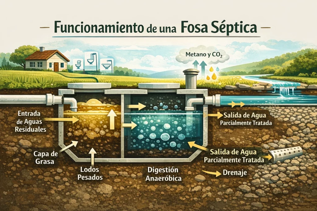 Las fosas sépticas son sistemas de tratamiento primario diseñados para gestionar las aguas residuales en viviendas que no disponen de conexión a una red de alcantarillado público. Se construyen bajo tierra y funcionan de forma autónoma mediante un tanque séptico dividido en dos o más compartimentos, donde se produce una separación natural de los residuos. Cuando las aguas procedentes de baños, cocinas y duchas llegan al tanque, los sólidos pesados se depositan en el fondo mientras que las grasas ascienden a la superficie, quedando en el estrato intermedio una fracción líquida parcialmente clarificada que fluye hacia el siguiente compartimento.